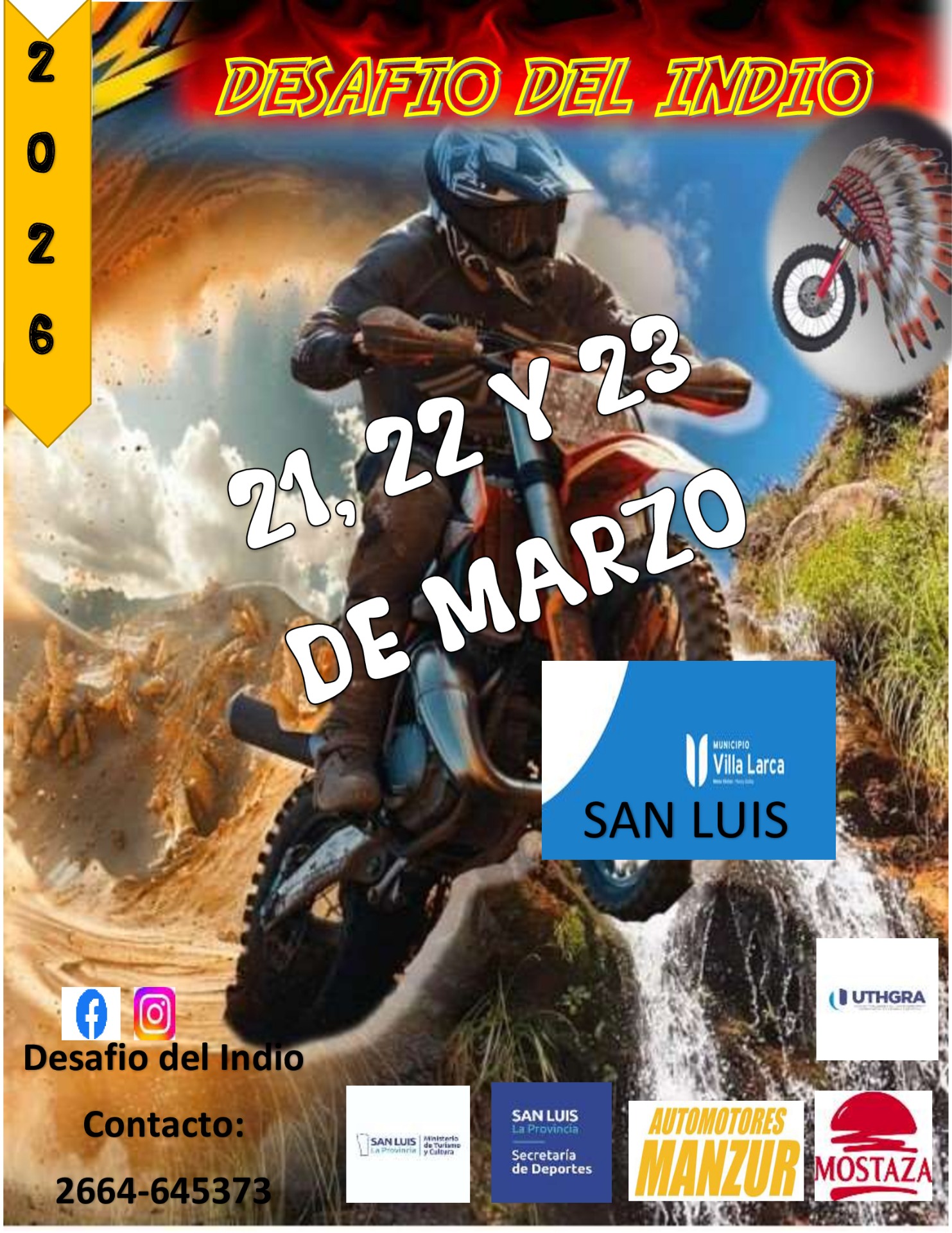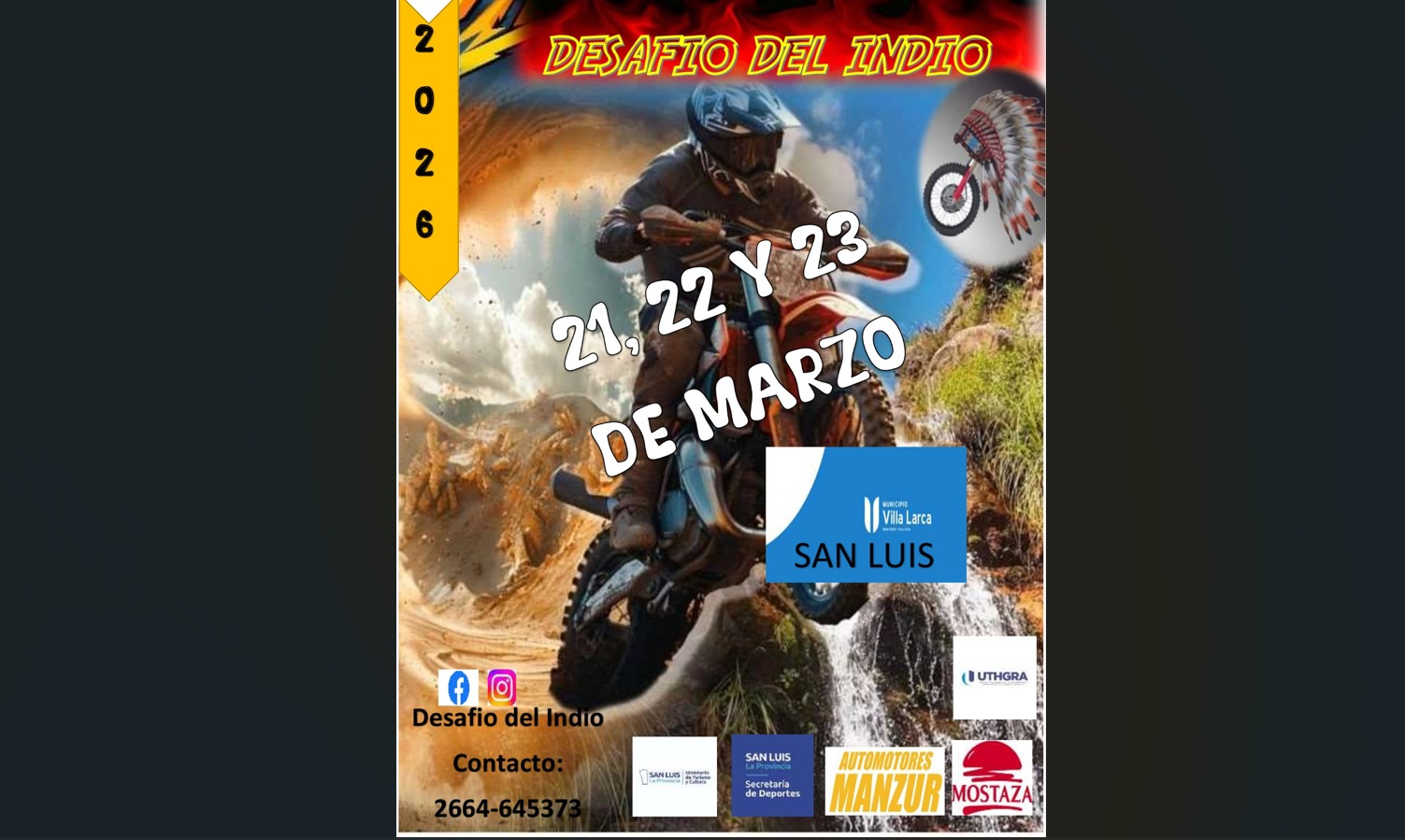 El Desafío del Indio 2026 se realizara los días 21, 22 y 23 de marzo para motos de enduro, dicha competencia de largo aliento, modalidad Cross country, en la localidad de Villa Larca, San Luis Argentina.